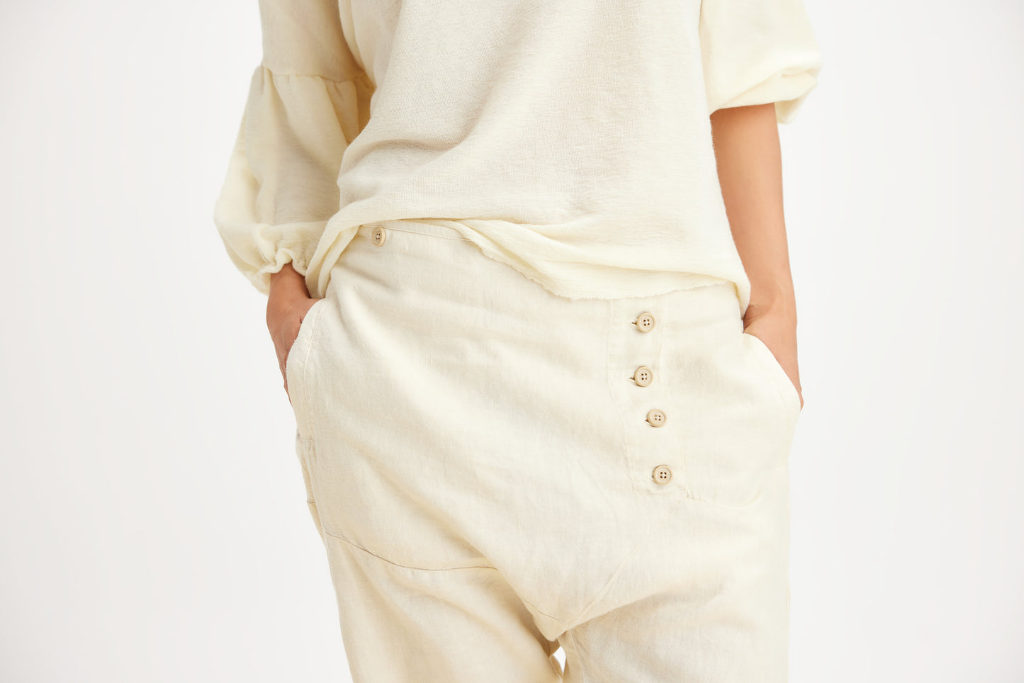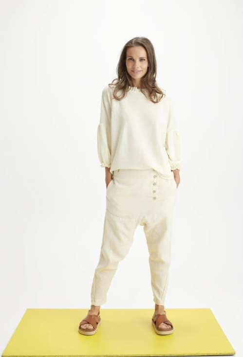 Geggjaðar 100% hör buxur. Anda vel og er mjög notalegur í heitu og köldu veðri. Svakalega flott snið og góð hönnun.