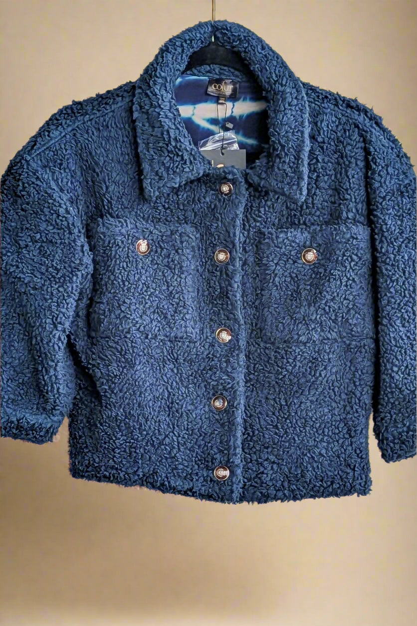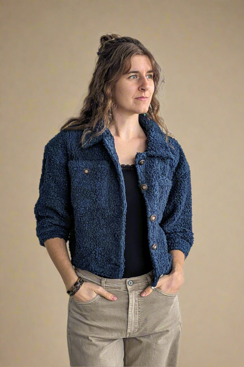Einstakur jakki úr bómullar teddy efni, fóðraður með silki.