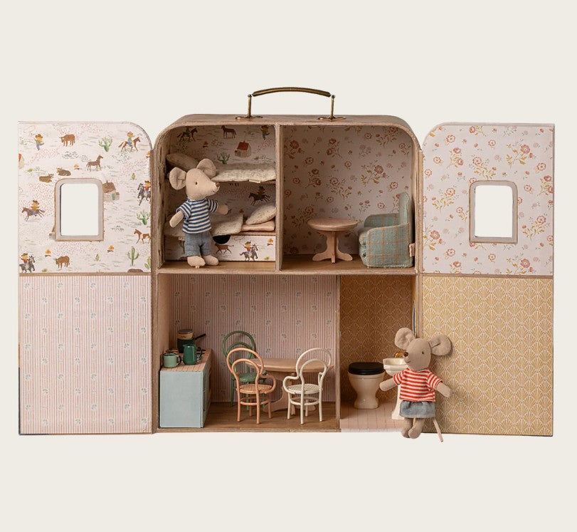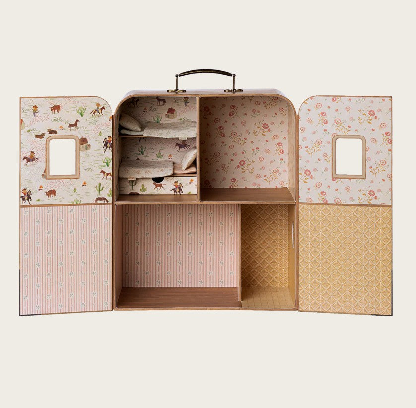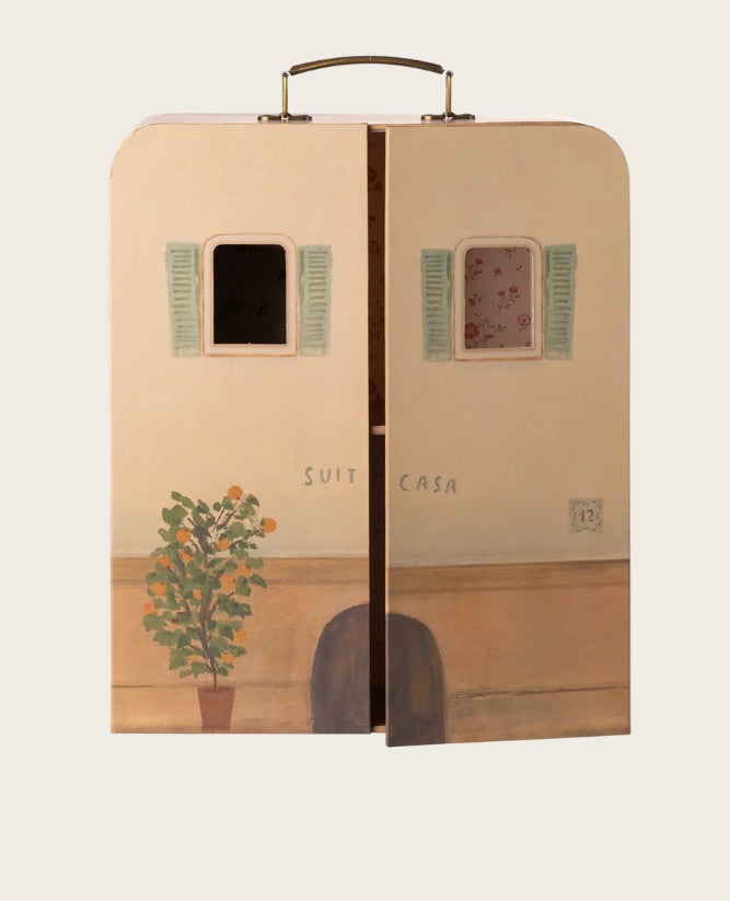 Velkomin í SuitCasa - lítið ferða hús. Það er stærðin fyrir litla bróður og systur. Tvö sett af mjúkum rúmfötum fyrir vini þína fylgja með en þú getur keypt nokkur önnur lítil húsgögn til að skreyta húsið.