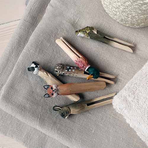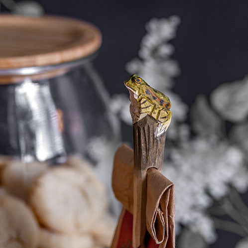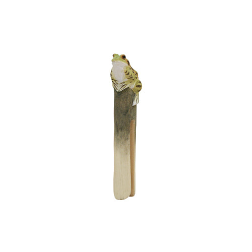 Útskorin klemma úr lindiviði. Froskurinn er handmálaður með vatnsmálningu.