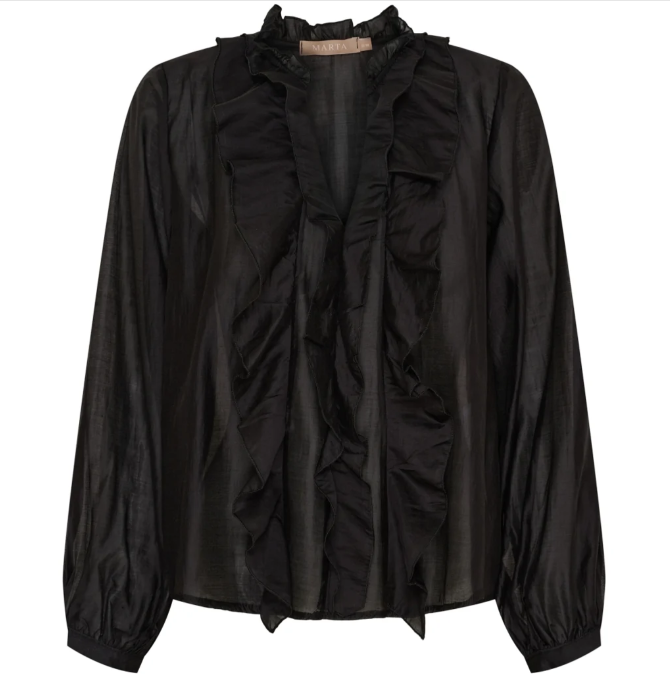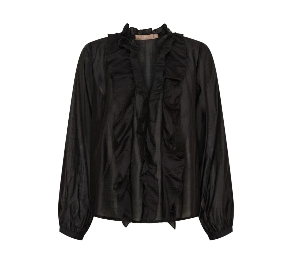Elegant blússa með pífum. Blússan er með löngum ermum og V-hálsmáli. Hægt er að nota hana með pilsi á dansgólfinu, með jakkaföt í vinnuunni eða með gallabuxum fyrir afslappaðra look.