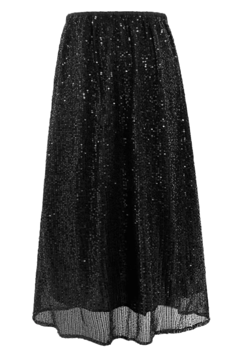 Svart palliettu midi pils. Pallietturnar glitra fallega á dansgólfinu. Einfalt klæðilegt snið sem hægt er að dressa upp & niður.