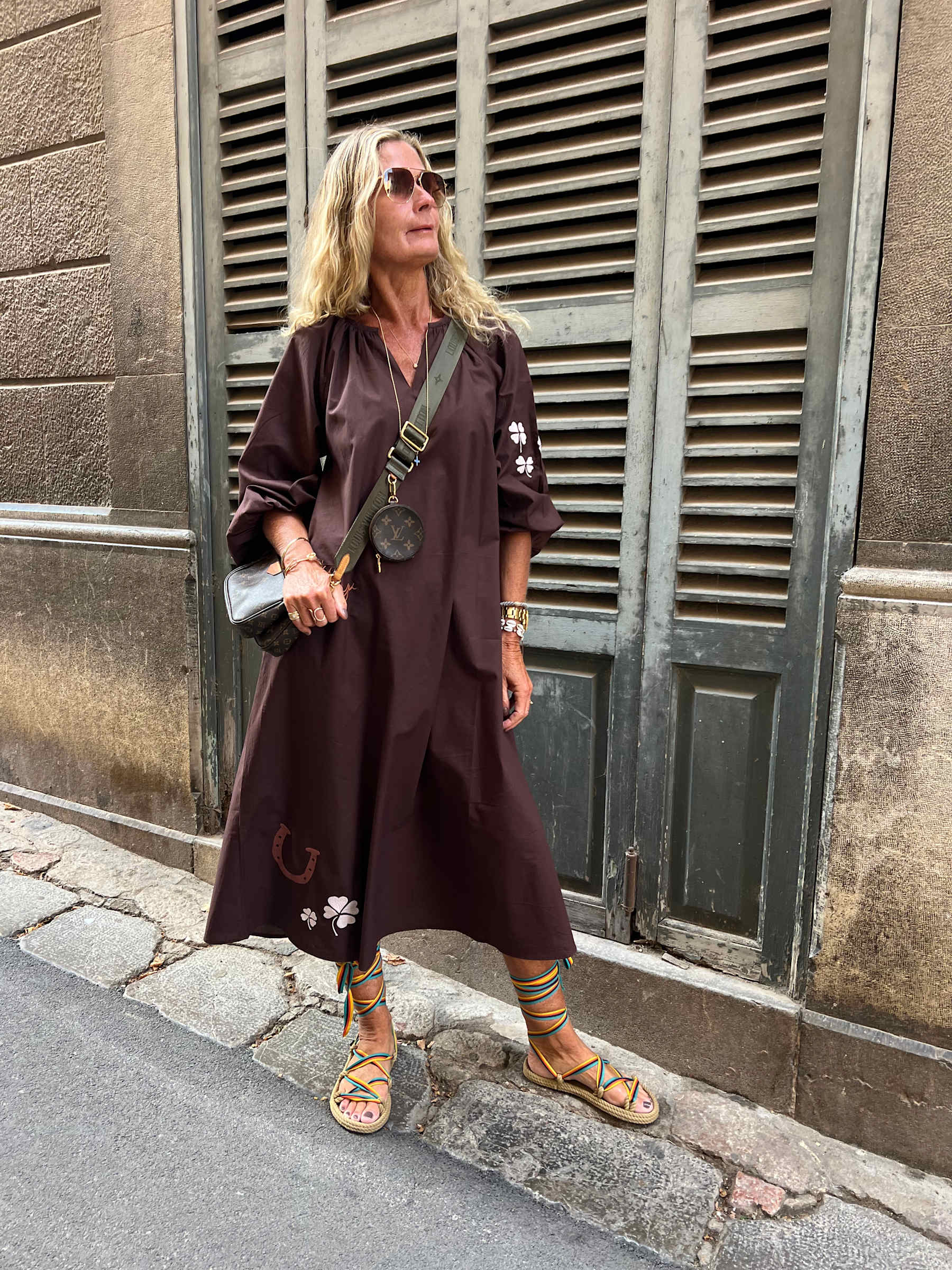 Brún „Good Luck“-kjóll frá Wauw. Hlýr súkkulaðibrúnn/grænn liturinn ásamt útsaumuðum fjögurra blaða smárum og skeifu. Rúmgott snið í léttri bómull sem hún fullkomið hvort sem þú ert heima, á skrifstofunni eða úti í bæ. Vasar og V-hálsmál.